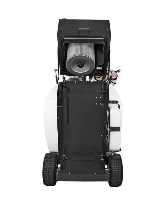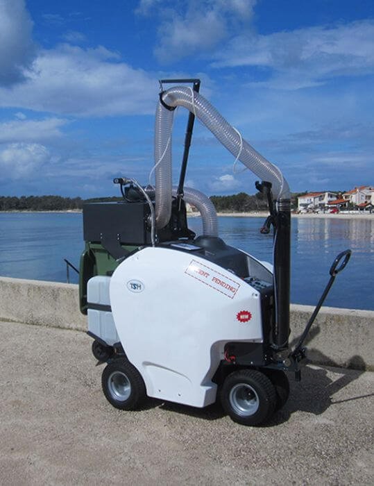 The electric street vacuum cleaner TSM ARIA 240 sucks any type of waste through the carbon fiber hose supported by the operator, which then flows into the 240 LT urban wheelie bin. It’s also equipped with a powerful PM10 fine particle filtering system positioned vertically, which retains the finest dust and injects only clean air into the environment.
